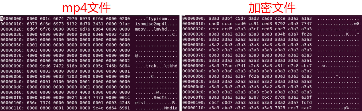 回到当前分析的文件。下图是mp4文件和加密文件内容的十六进制显示,mp4文件中有大量的00字节,而加密文件中有大量的A3字节,根据网上查找到的资料猜测,这里也是采用按字节与A3异或运算的方式加密得到的。前表可知,MP4文件中5至12字节的是6674 7970 6973 6F6D,而加密文件的5至12字节为:C5D7 DAD3 CAD0 CCCE,将其按位与A3异或运算的结果是:6674 7970 6F6D,这与MP4文件的标识符相同。由此初步验证猜想,网易云音乐Android客户端的缓存文件也是将源文件按位与A3异或运算生成的。